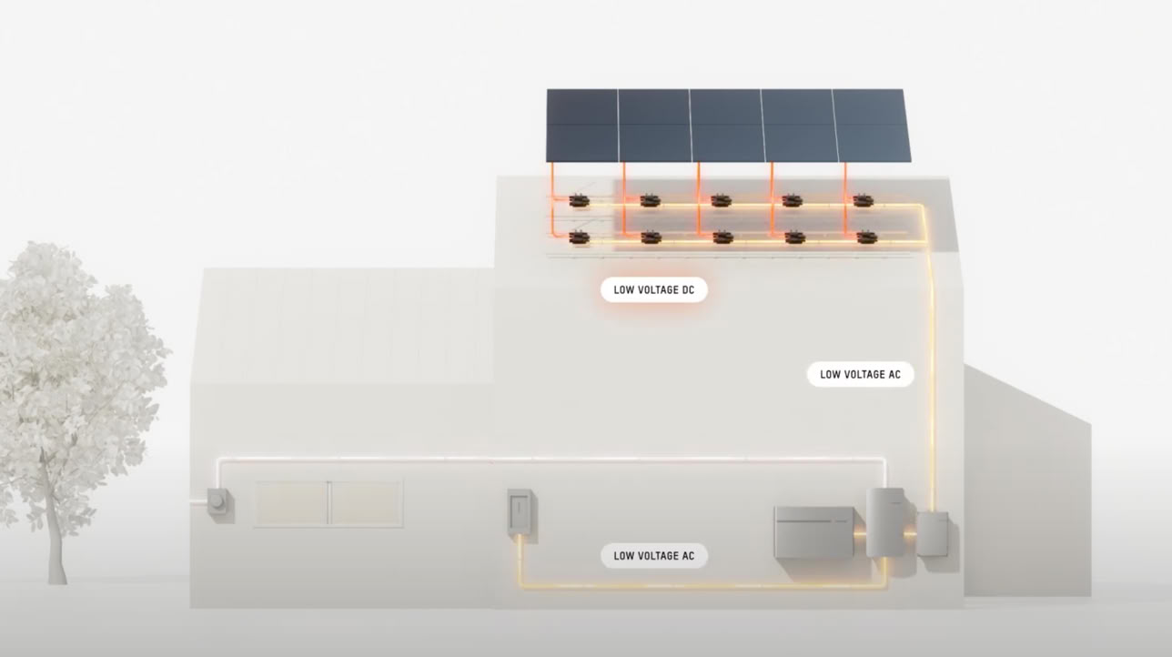 Gleichstrom-Einspeisung: Die Solarmodule erzeugen Gleichstrom (DC), wenn sie Sonnenlicht einfangen. Dieser Gleichstrom wird von den Solarmodulen zu den Enphase Mikrowechselrichtern geleitet, die direkt unter jedes Moduls installiert sind.